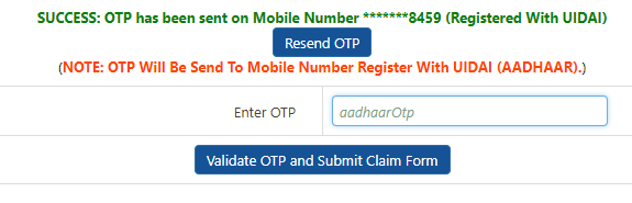 - An OTP will be transferred to your mobile number enrolled with Aadhaar. Mention this OTP and tap on validating OTP. Then Submit Claim Form.